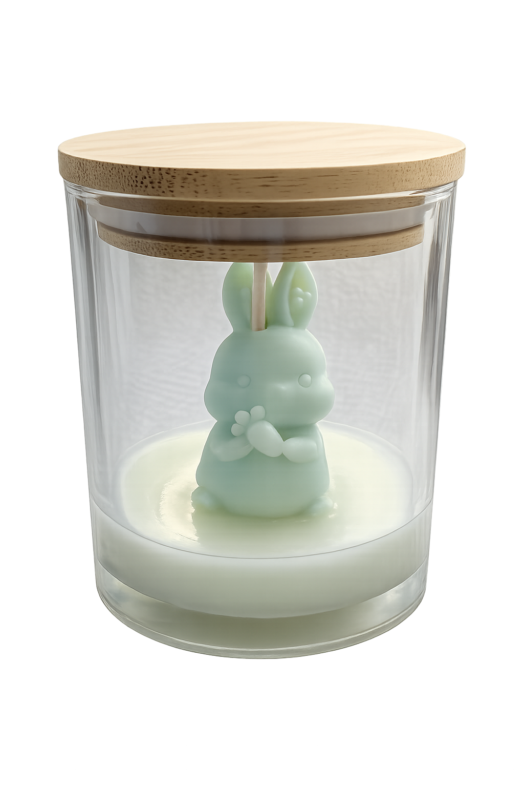 Duftfreie Designkerze im Glas mit eingegossener Hasenfigur. Zartes Pastell, reines Kerzenlicht und liebevolle Handarbeit – ein ruhiges Highlight für deine Osterdekoration.